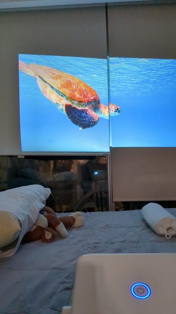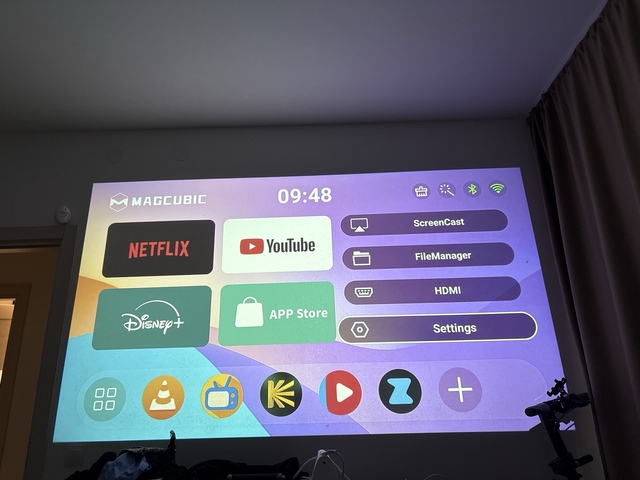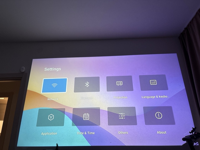 Классный проэктор!Интуитивно понятный интерфейс.Яркая картинка.Видео с телефона,с носителей,с интернета.Но пока проэцировали на голую стену.Пока ремонт экран не вешали..